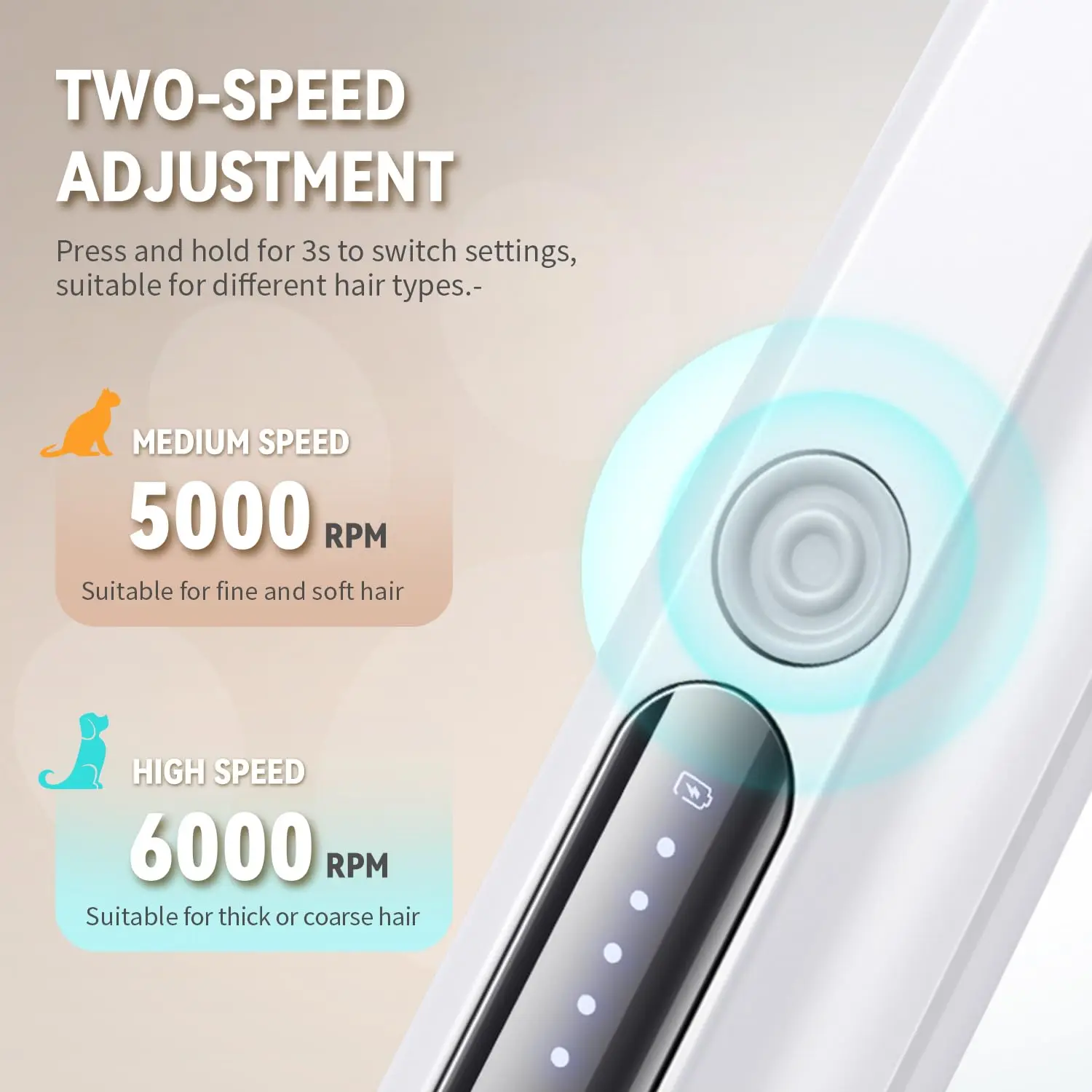 【Dual Speed & Long-Lasting Power】Choose between 2 optimized speeds (5,000 RPM for soft/neat fur, 6,000 RPM for coarse/thick fur). Features USB rechargeability (fully charges in 1 hour) and provides up to 2 hours of cordless constant runtime - sufficient for multiple pets.